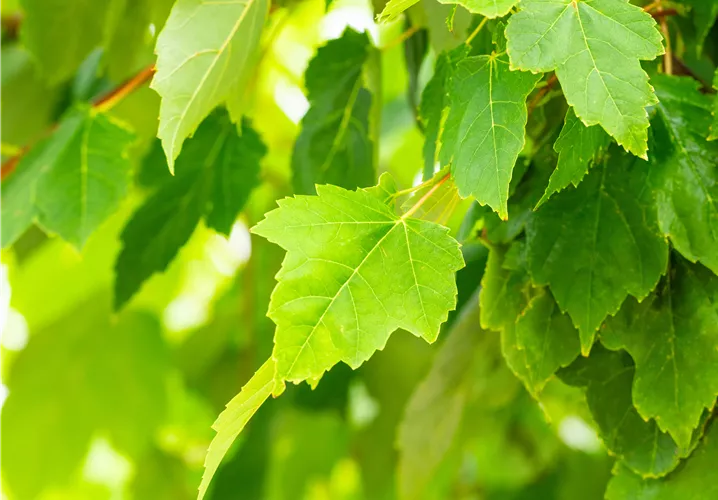sommergrün, rot gestielt, dunkelgrün, glänzend, gelappt, gegenständig, etwa 8 - 10 cm