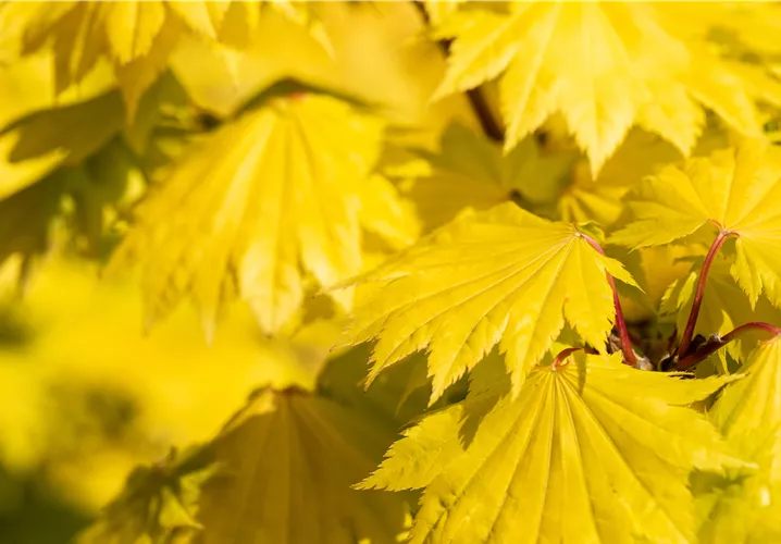 sommergrün, Austieb hellgelb, rot gestielt, gelbgrün, rote Aderung, gelappt bis doppelt gesägt, gegenständig, etwa 6 - 8 cm, sehr zierend