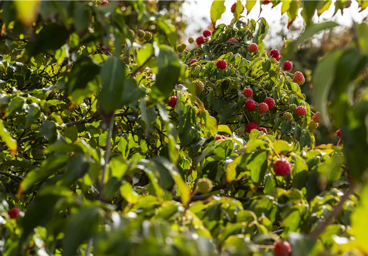 rosarote, beerenartige Steinfrüchte, essbar, fader Geschmack, Reifezeit im September, sehr zierend