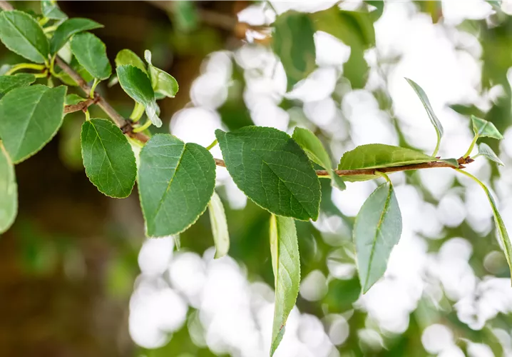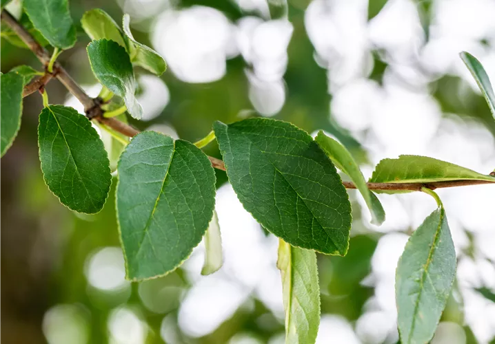 sommergrün, dunkelgrün, glänzend, ledrig, eiförmig, gekerbt, wechselständig, etwa 3 - 5 cm
