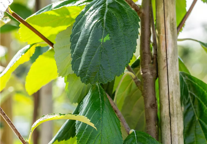 Deciduous, silver-white shoots, dark green, tomentose underneath, ovate, alternate, about 8 - 10 cm, fall late