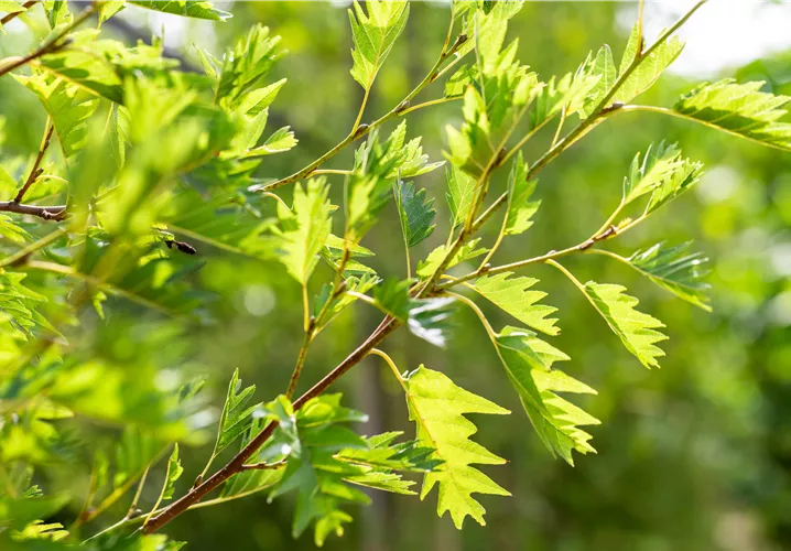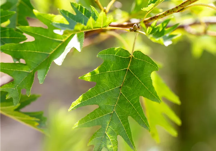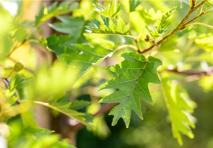 caduques, vert foncé, arrondies, fendillées, alternes, environ 6 - 10 cm, très décoratives, tombent tardivement