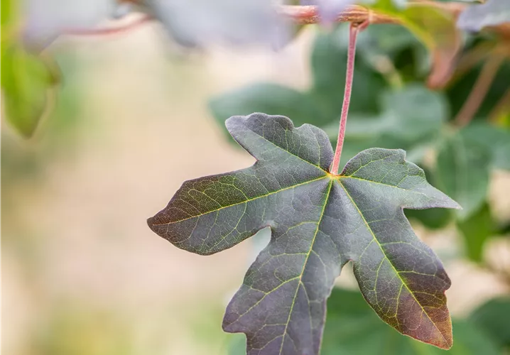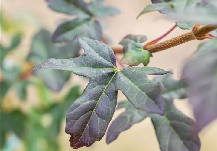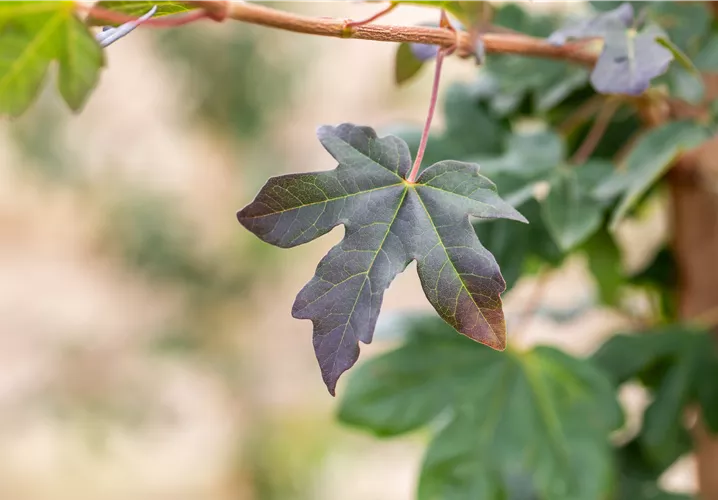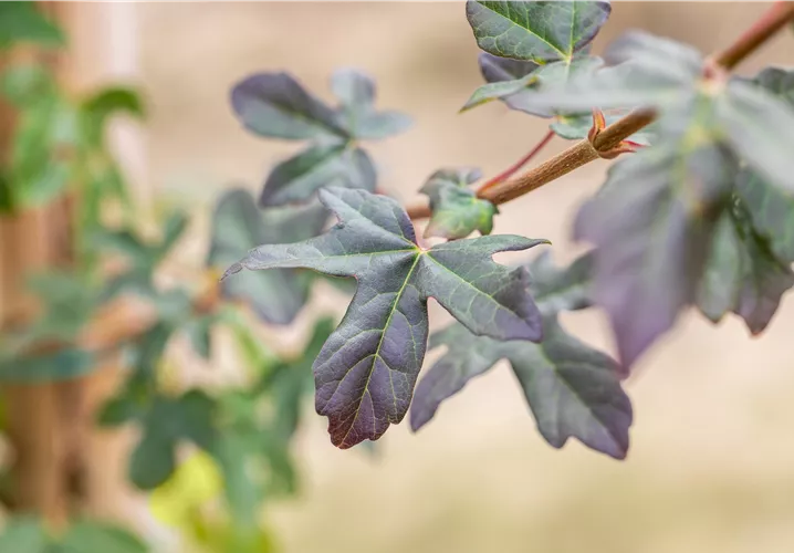 caduques, exsudation rouge, vert foncé, 3-5 lobes, ondulées, opposées, environ 5 - 8 cm
